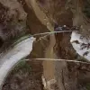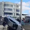 Kaza yapan otomobil köprüde asılı kaldı