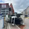 Kocaeli'nin Derince ilçesinde tırın üzerindeki iş makinesi devrildi, 1 kişi yaralandı.