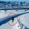 Karlı yolda paletli ambulansın önünden koşan kurt görüntülendi